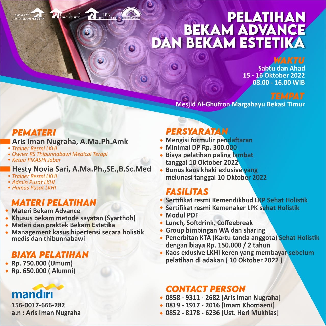 Bekasi Timur – Kami segera menghadirkan acara Pelatihan Bekam Advance dan Bekam Estetika pada Sabtu – Ahad, tanggal 15 – 16 Oktober 2022 pukul 08.00 s.d. 16.00 WIB bertempat di Mesjid Al-Ghufron Margahayu Bekasi Timur. Dengan pemateri handal Bapak Aris Iman Nugraha, A.Ma.Ph.Amk (Trainer LKHI) dan Ibu Hesty Novia Sari, A.Ma.Ph, SE., B.Sc.Med (Trainer LKHI). Registrasi paling lambar pada tanggal 10 Oktober 2022. Simak pamflet kegiatan di bawah ini.