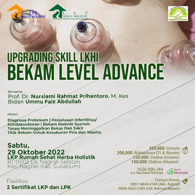 Sukabumi – LKP dan LPK Sehat Holistik akan mengadakan acara Bekam Level Advance untuk Upgrading Skill LKHI terbuka untuk umum dan alumni. Acara direncanakan Insya Allah pada tanggal 29 Oktober 2022 bertempat di LKP Rumah Sehat Herba Holistik di Nagrak Kab. Sukabumi. Materi yang akan disampaikan seputar Diagnosa Prabekam, Penjelasan Infertilitas/Ketidaksuburan, dan Bekam metode Syartoh tanpa meninggalkan bekam dan sakit. SImak pamflet acaranya di bawah ini.